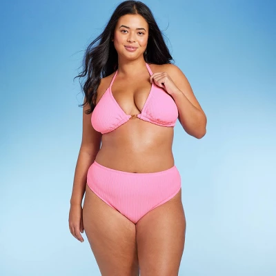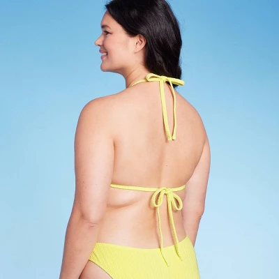 Triangle bikini top from Wild Fable™ in a solid color with plisse texture. Accented with a butterfly charm on the front. Made of a soft fabric with added spandex. Halter straps with behind-the-neck ties and a slender string with back fastening complete the look.