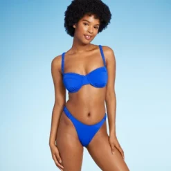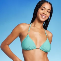 Square-neck bikini top from Wild Fable™ features contrasting trim and shirring at front. Soft and stretchy fabric with full lining offers comfort. Adjustable straps with back hook-and-loop fastener helps keep it secure. Removable cups lend a customizable look.