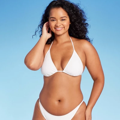 Triangle bikini top from Wild Fable™ in a solid hue. Made from soft fabric with spandex for stretchy comfort in and out of the water. Removable cups offer customizable coverage. Adjustable thin straps plus back and behind-neck ties provide the perfect stay-put fit.